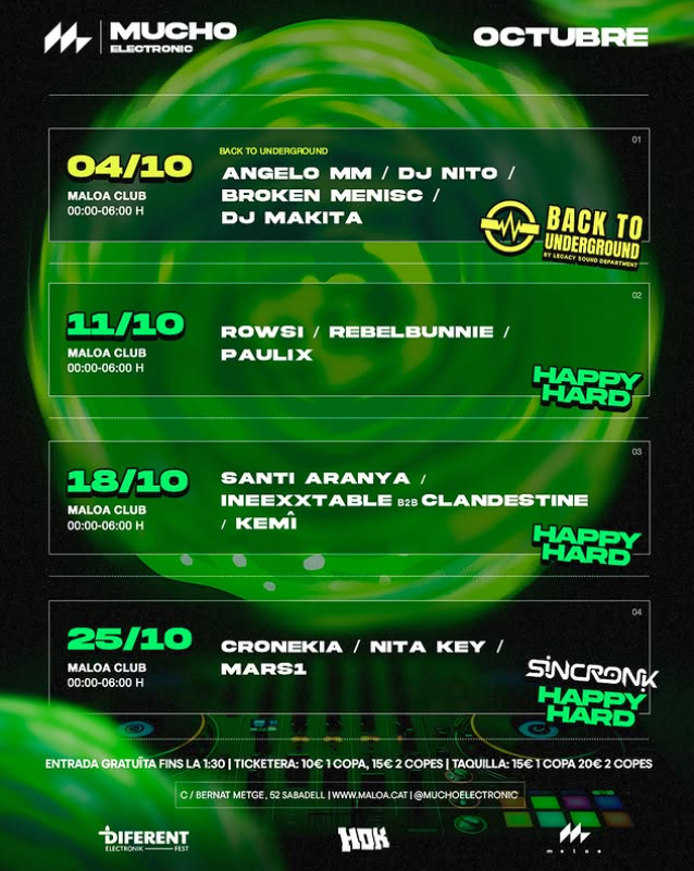 El Vallès Occidental suma un nuevo punto de encuentro para los amantes de la música electrónica: este mes de octubre arranca MUCHO Electrònic, un ciclo que transformará los sábados de Maloa Club (Sabadell) a ritmo de Hard Dance, Bounce y Hard Trance.