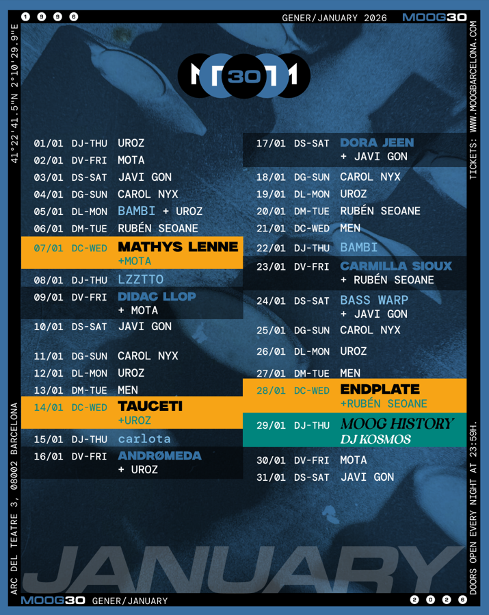 Si algo dejó claro 2025 es que MOOG sigue siendo uno de los pilares fundamentales de la electrónica de club en Barcelona. Y 2026 arranca igual: electrónica diaria, dos salas y ese formato sin concesiones que lo ha convertido en un ritual de ciudad. Pero este enero tiene un subtexto mayor: MOOG cumple 30 años. Abrió el 21 de junio de 1996, justo después de una de las primeras ediciones de Sónar, y desde entonces ha funcionado como termómetro (y a veces como motor) de la noche barcelonesa.