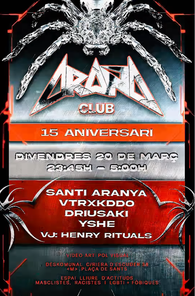Aunque ahora tenemos la mirada puesta en el 20 de marzo, Santi ya está preparando la próxima temporada, donde podremos esperar más eventos en Barcelona para seguir aportando referencia en la escena hard de la ciudad, y además, el regreso a la capital estatal. Araña va a volver a Madrid, la ciudad que le vio nacer. De momento, no podemos adelantar mucho más de su vuelta, pero lo que sí podemos hacer es ir a celebrar su 15 aniversario el próximo 20 de marzo en la Deskomunal, su casa en Barcelona.