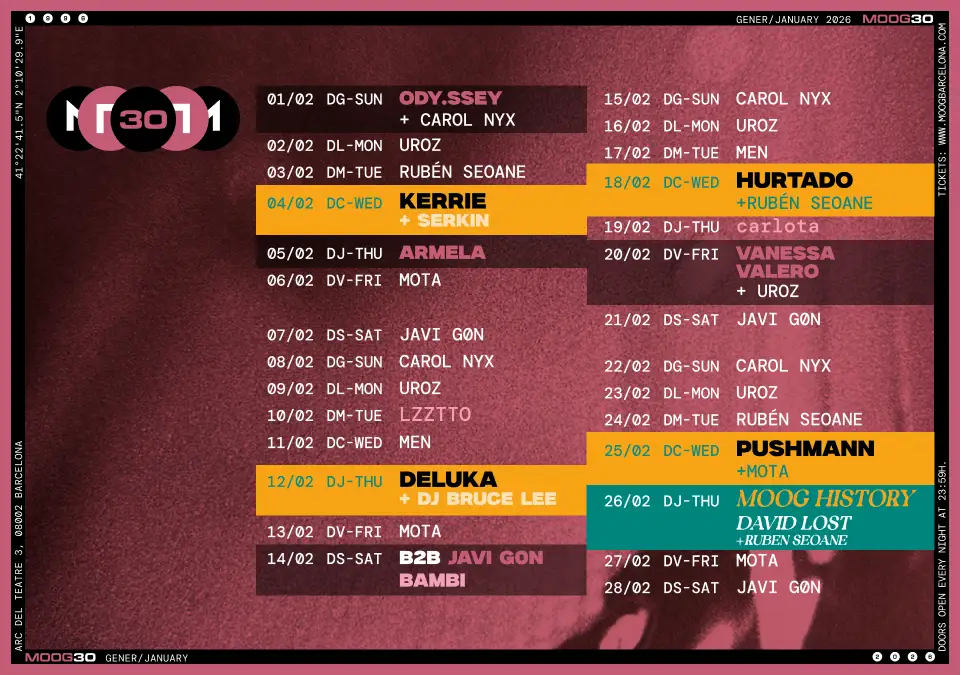Las entradas para todas las fechas de febrero en Moog ya están disponibles. Se pueden adquirir de forma anticipada o directamente en la taquilla del club.
